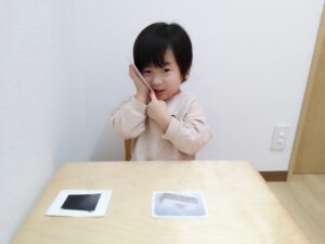 そして、先生が『電話、もしもしだね~!』と言うと、カードを自分の耳にあてて、「もしもし~!」と話す真似をしてくれていました!(^^)!✨