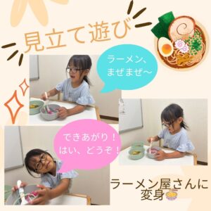集中して、お花のビーズ通しに取り組んだ後は…紐をラーメン・お花のビーズを具材に見立てて、ラーメン屋さんのごっこ遊びをしました🍜✨